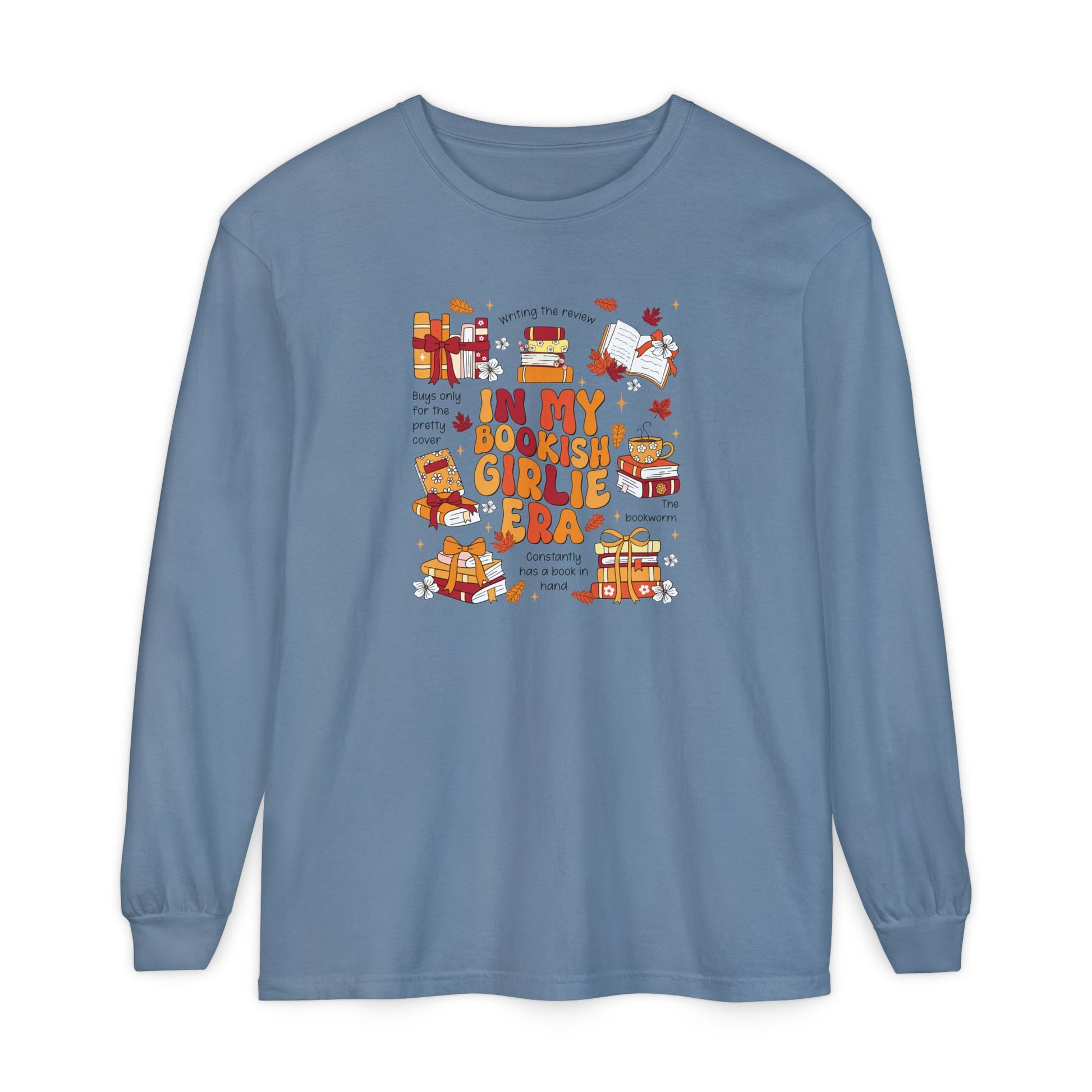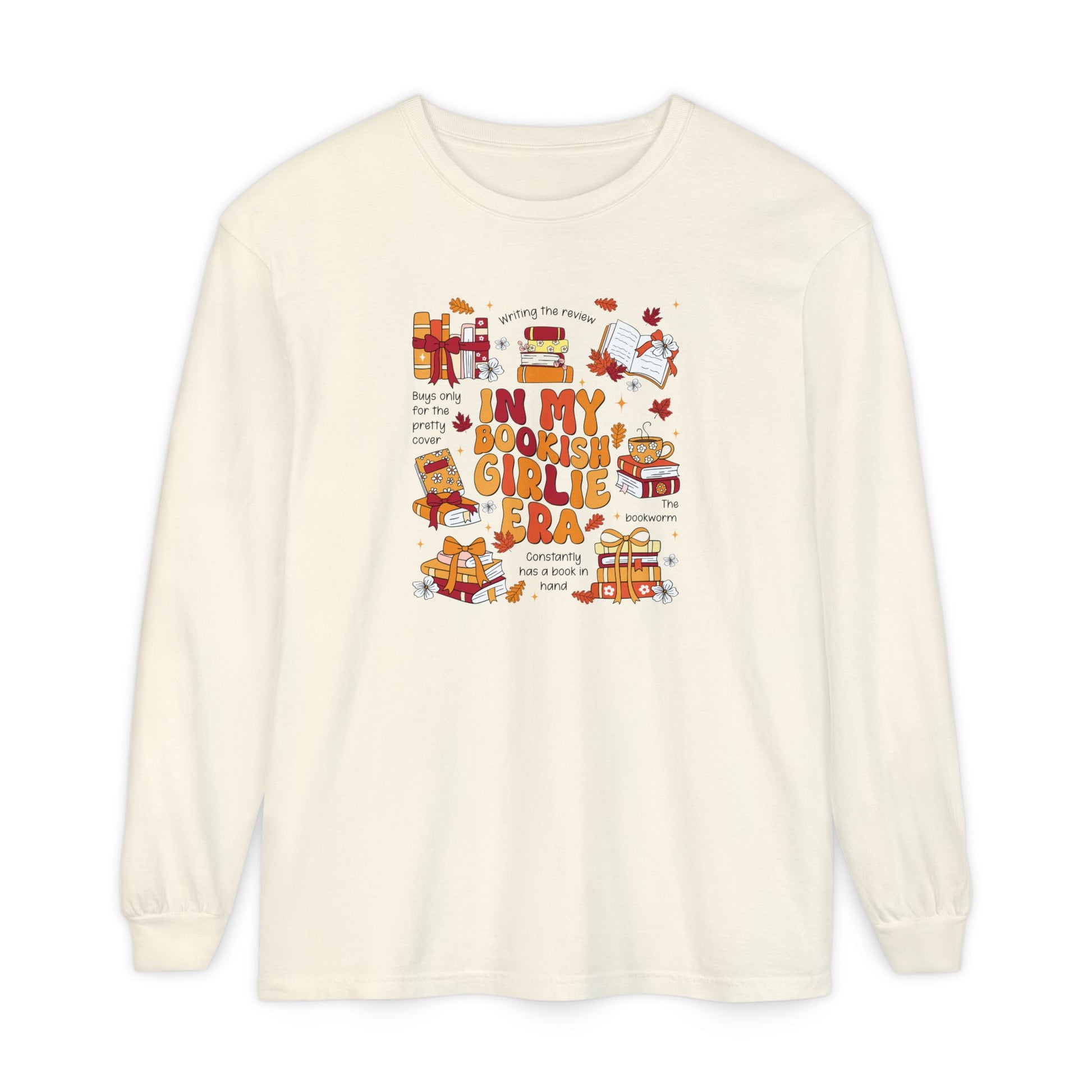 Step into your bookish girlie era in comfort and color! This cozy long-sleeve Comfort Colors tee is made for readers who know that every chapter deserves a little main-character energy. Featuring warm autumnal tones, stacks of ribbon-tied books, and a playful retro font, this design celebrates the cozy chaos of being a book-obsessed girlie at heart.