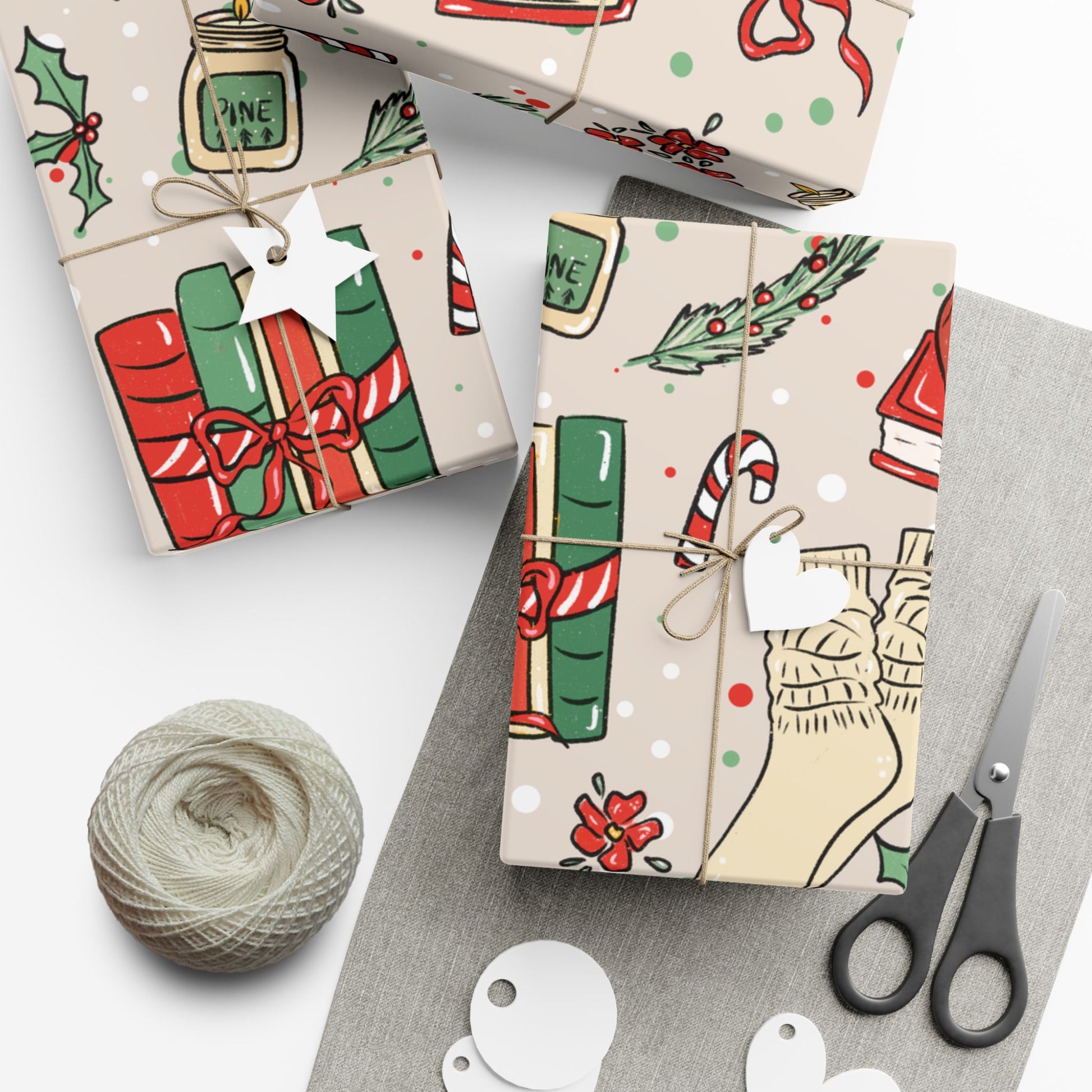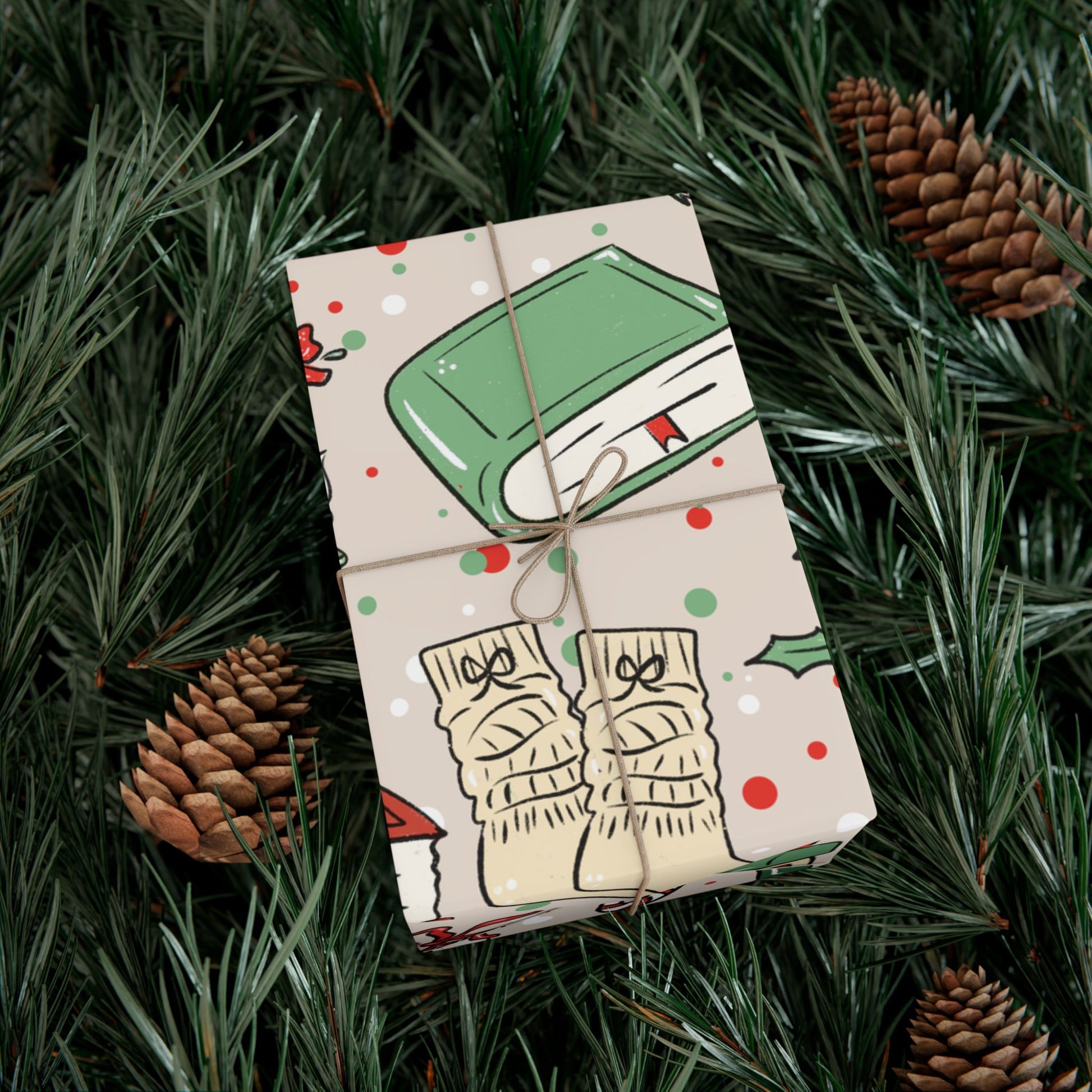 Celebrate the magic of the season with our Cozy Christmas Chapters wrapping paper — a heartwarming design made for book lovers who believe the best stories are shared during the holidays. Featuring stacks of red and green books tied with ribbons, steaming mugs of cocoa, pine candles, knitted socks, candy canes, and sprigs of holly, this charming print captures the feeling of curling up by the fire with your favorite read.