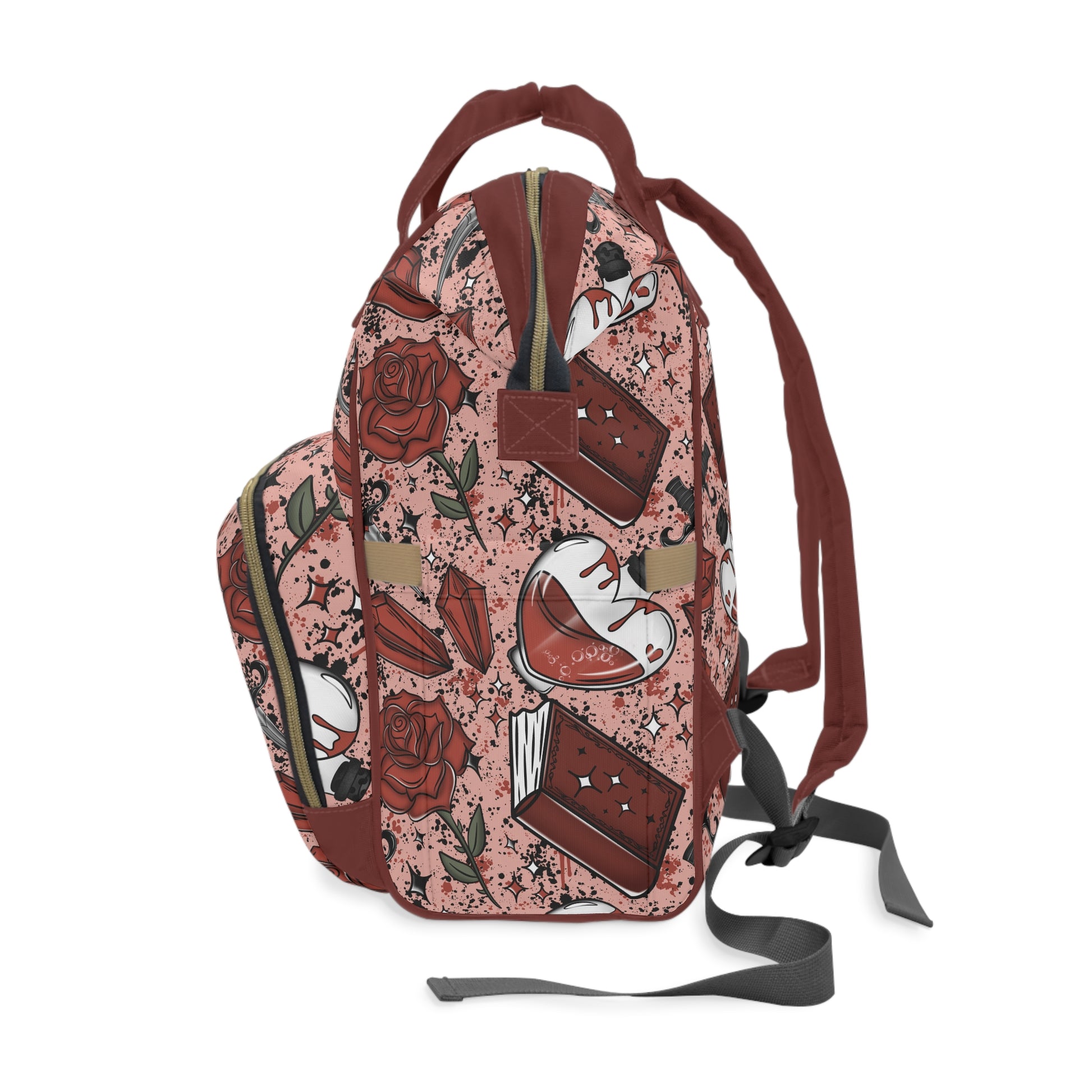 Dark, bold, and endlessly practical—our Crimson Romance Diaper Backpack is more than just a parenting essential, it’s a statement piece for book lovers everywhere. Featuring a striking design of blood-red roses, enchanted books, potions, crystals, and daggers, this backpack channels the moody allure of gothic romance while offering all the functionality you need for everyday life.