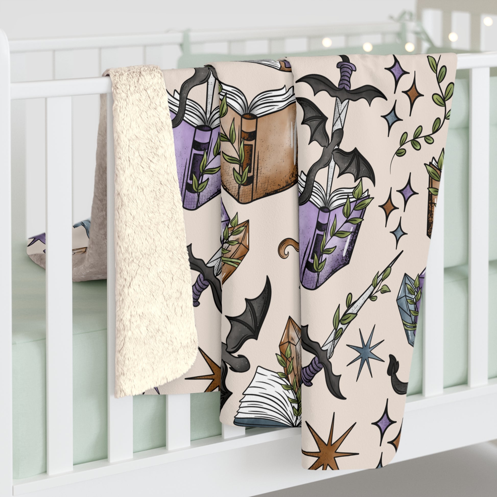 Featuring a mesmerizing design of open books, gleaming crystals, swords, stars, and dragons entwined with ivy, it’s the perfect companion for late-night reading sessions or lazy weekend mornings lost in another world. Whether you’re wrapped up with your latest romantasy novel or binge-watching your favorite fantasy series, this sherpa blanket is your key to cozy magic.