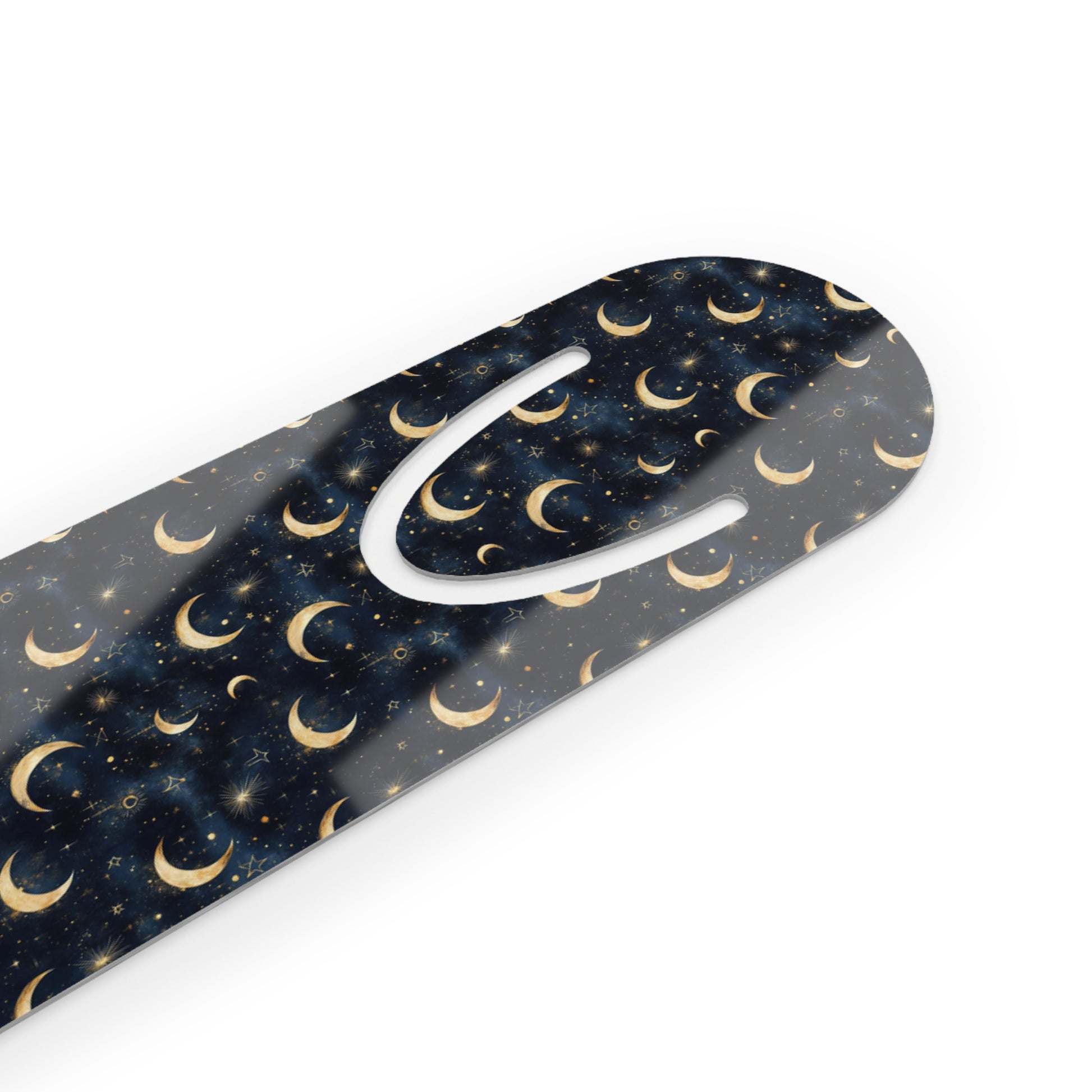 Drift through your favorite stories under a sky full of stars with our Moonlit Chapters Bookmark. Featuring a stunning celestial design of shimmering gold moons and constellations against a deep midnight background, this piece captures the magic of quiet nights spent lost in a good book. Perfect for dreamers, stargazers, and book lovers alike, it adds a touch of cosmic wonder to every page you turn.
