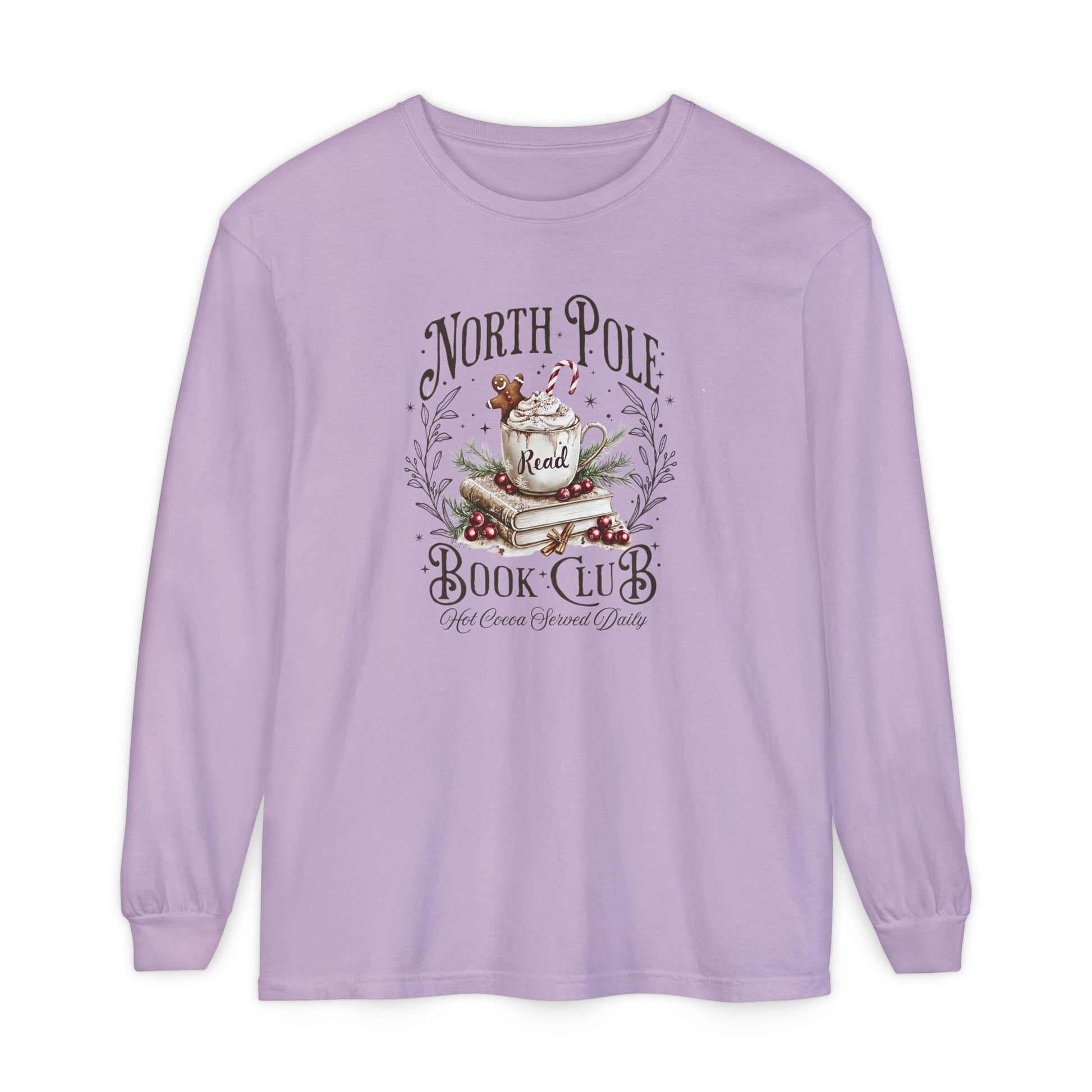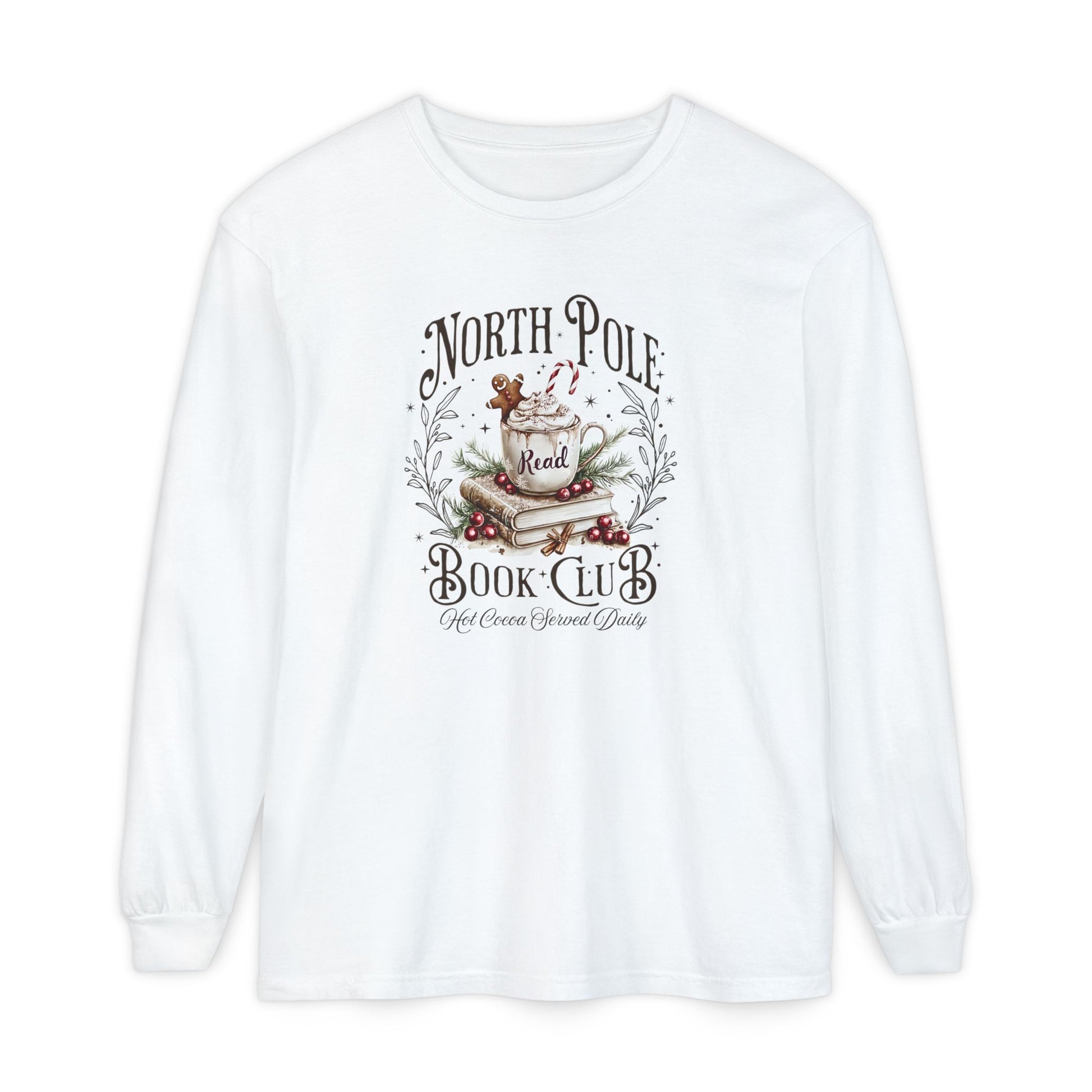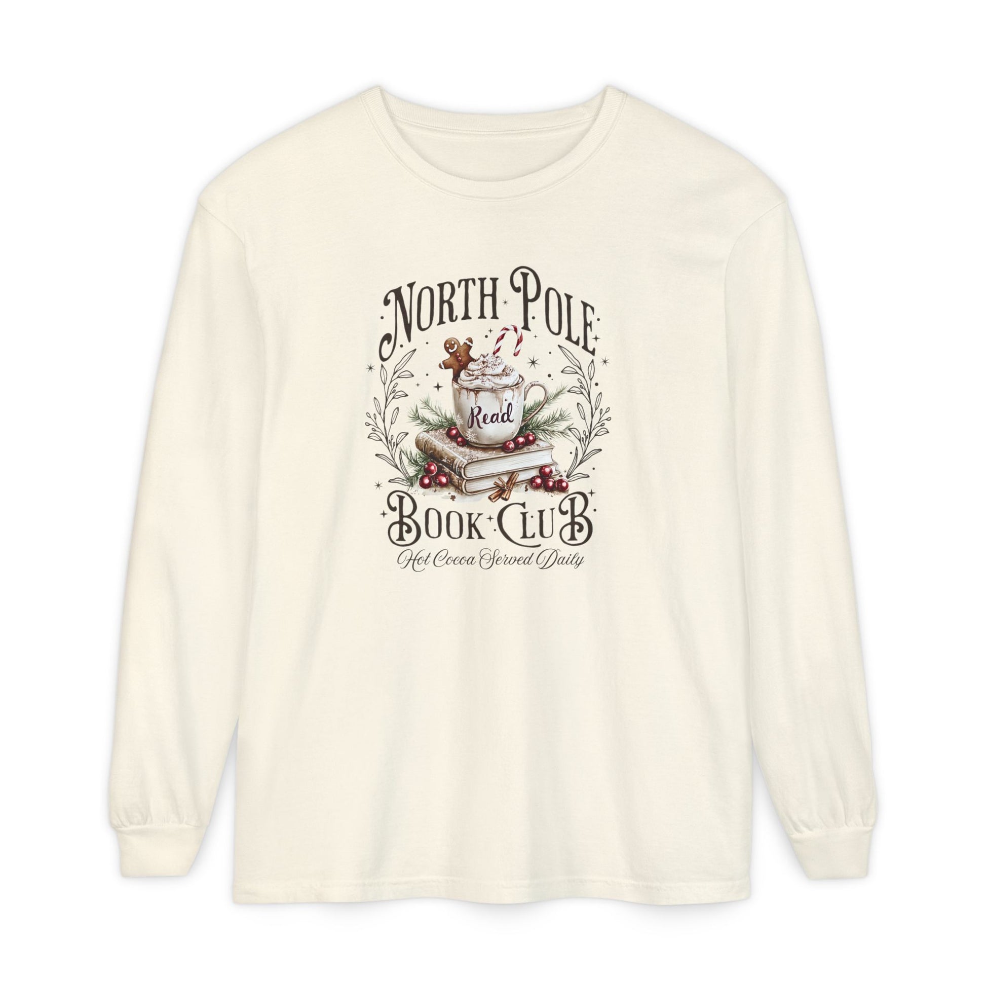 Step into a winter wonderland of stories with the North Pole Book Club long sleeve tee. Featuring a whimsical design of stacked books topped with a steaming mug of cocoa, whipped cream, candy cane, and a gingerbread cookie—this shirt captures the magic of cozy holiday reading. Perfect for bookworms who know the season isn’t complete without hot cocoa, twinkling lights, and a stack of TBRs.