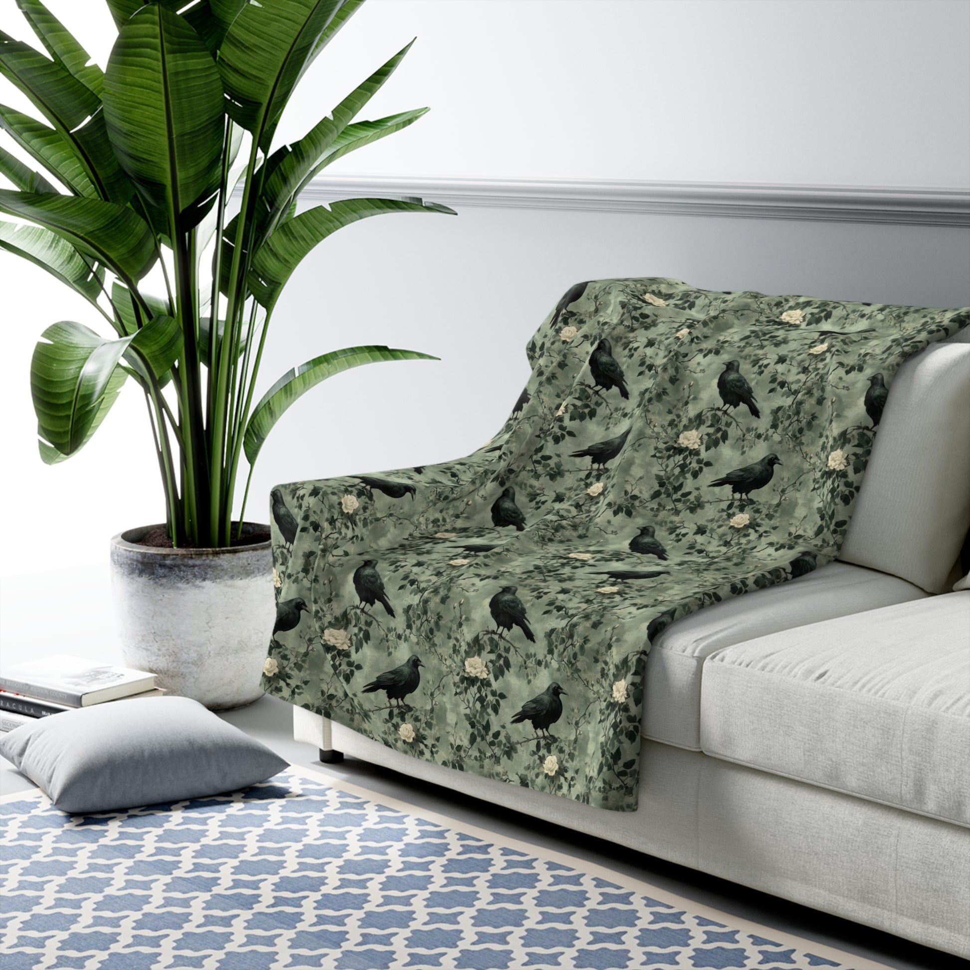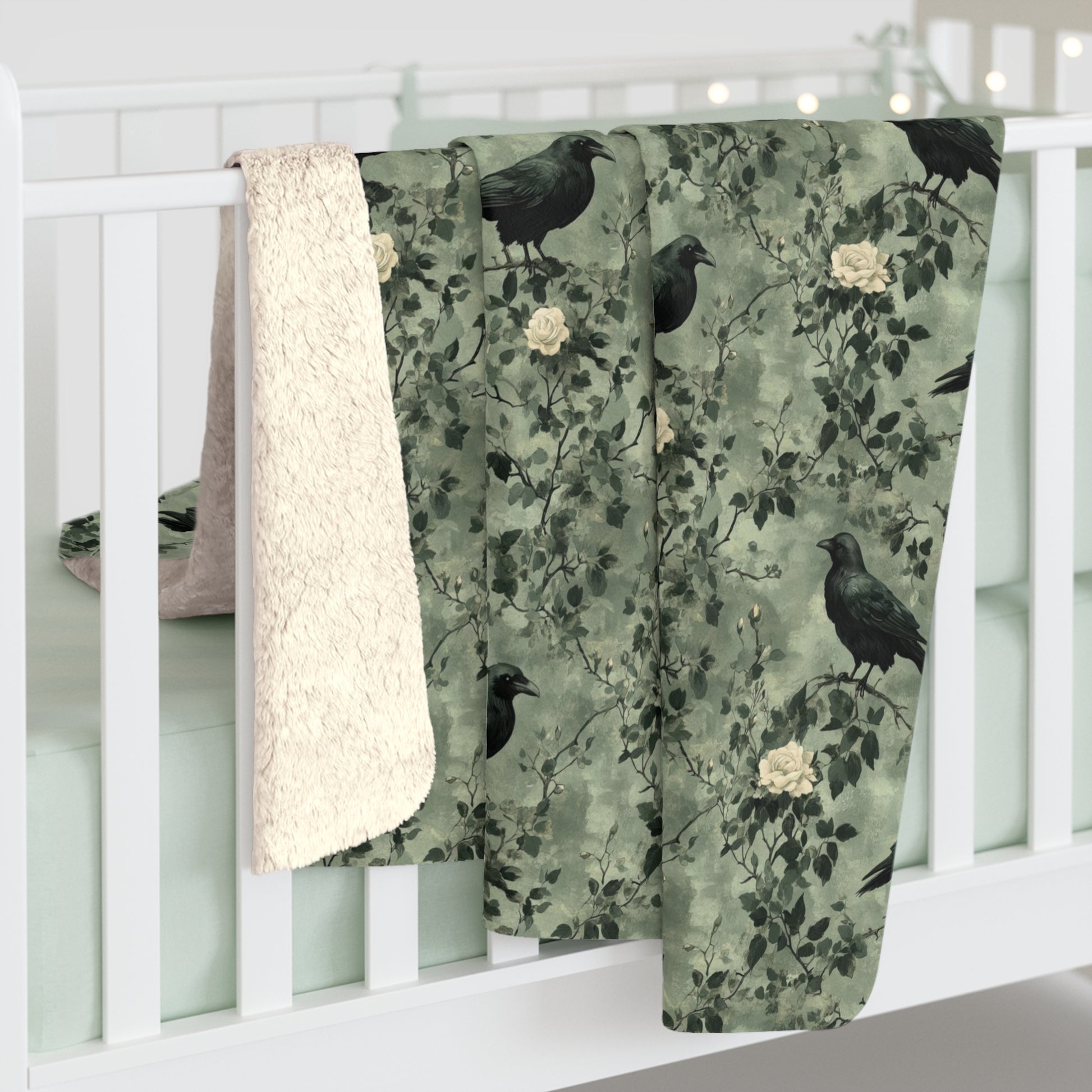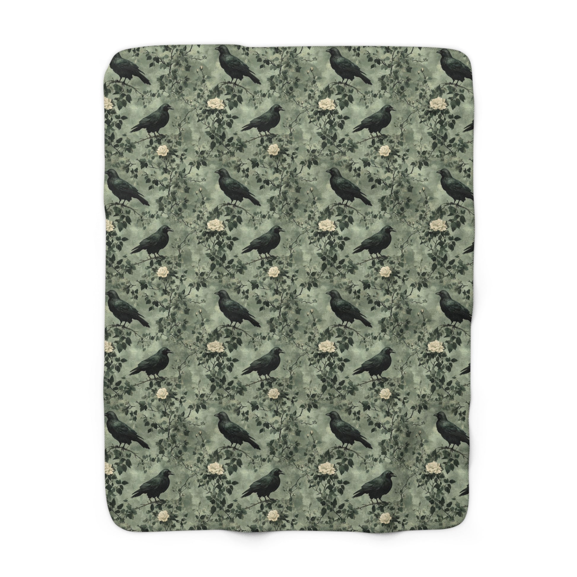 The design features inky black ravens perched among pale roses and thorny vines—an aesthetic nod to dark academia and the chilling elegance of Edgar Allan Poe’s The Raven. One side showcases the moody, detailed print, while the reverse offers irresistibly plush sherpa fleece that feels like the softest embrace, perfect for stormy nights spent with your favorite gothic novel.