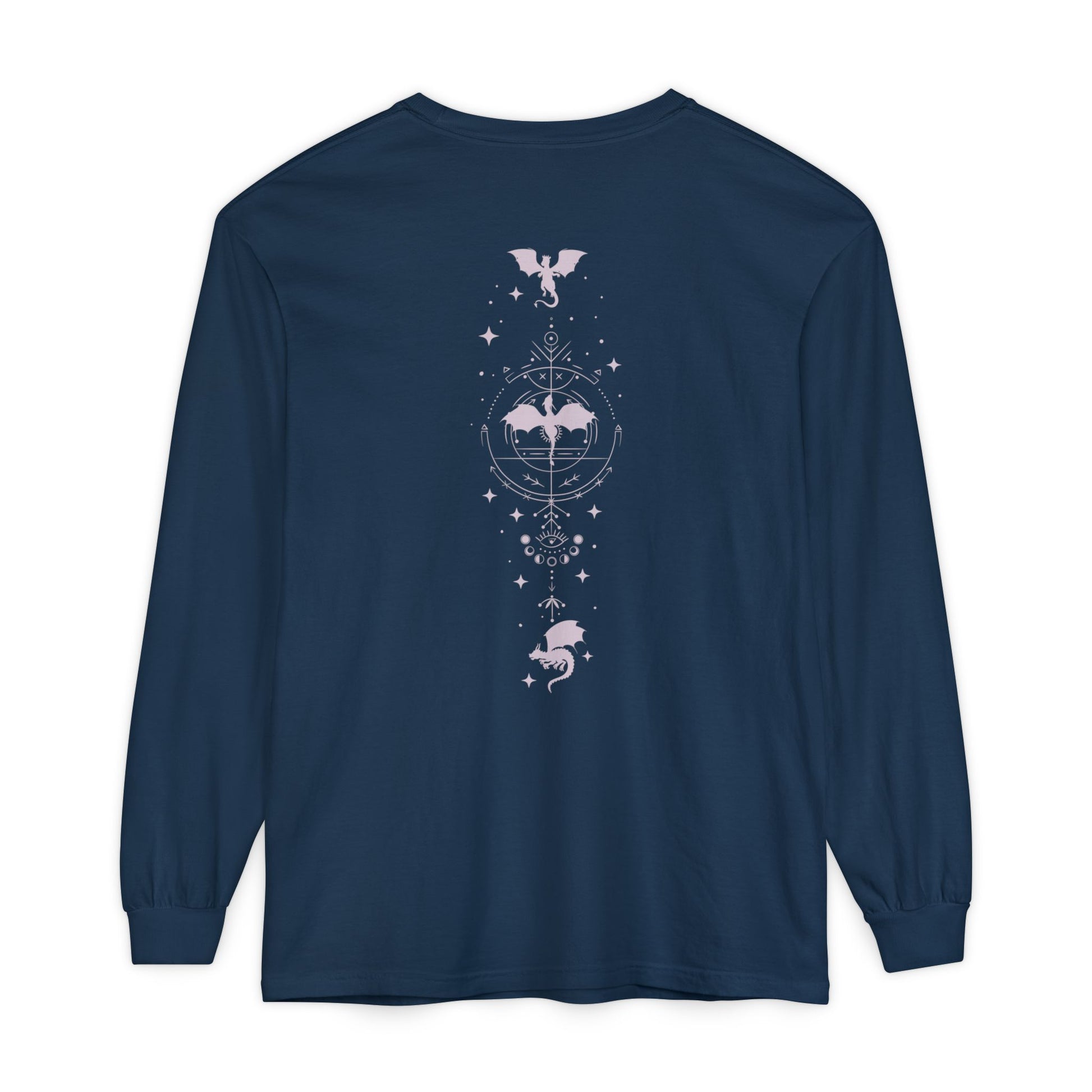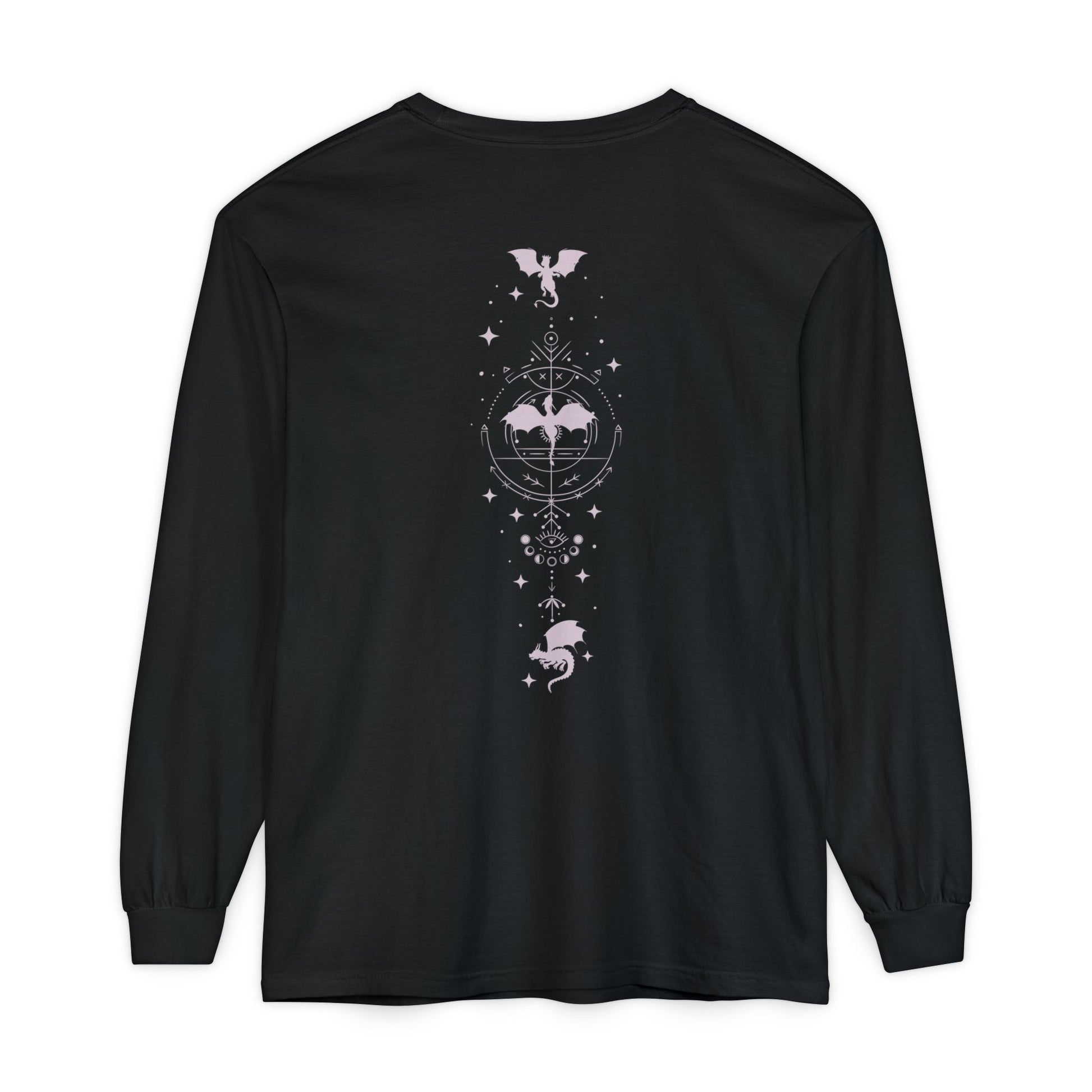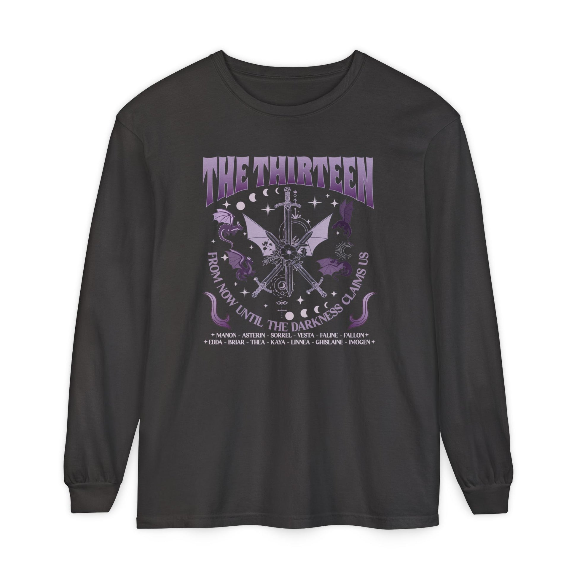 Honor the courage, sacrifice, and unbreakable bond of The Thirteen with this officially licensed Sarah J. Maas design. This long sleeve tee features a bold front graphic with the names of all thirteen, framed by wings, swords, and moonlit details, along with the iconic vow: “From Now Until the Darkness Claims Us.” The back showcases an intricate emblem of wings, stars, and symbols—a tribute to their legacy.