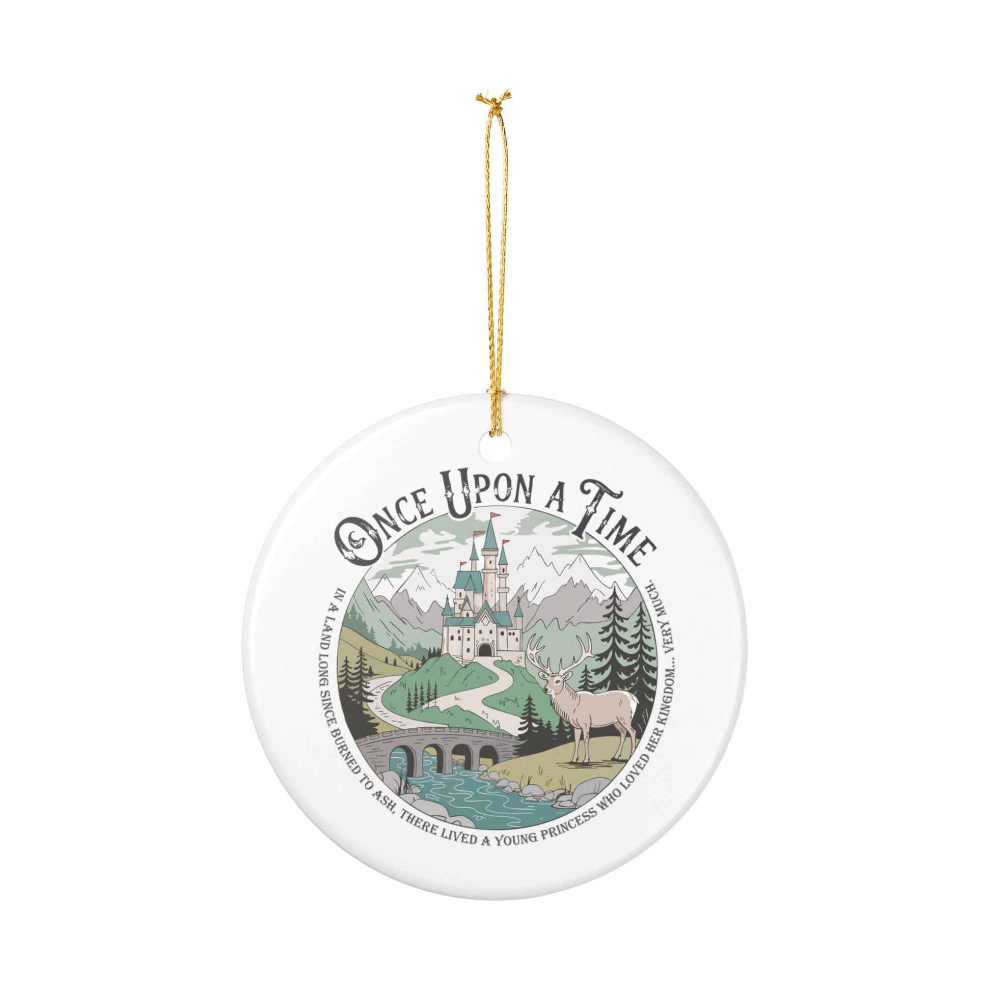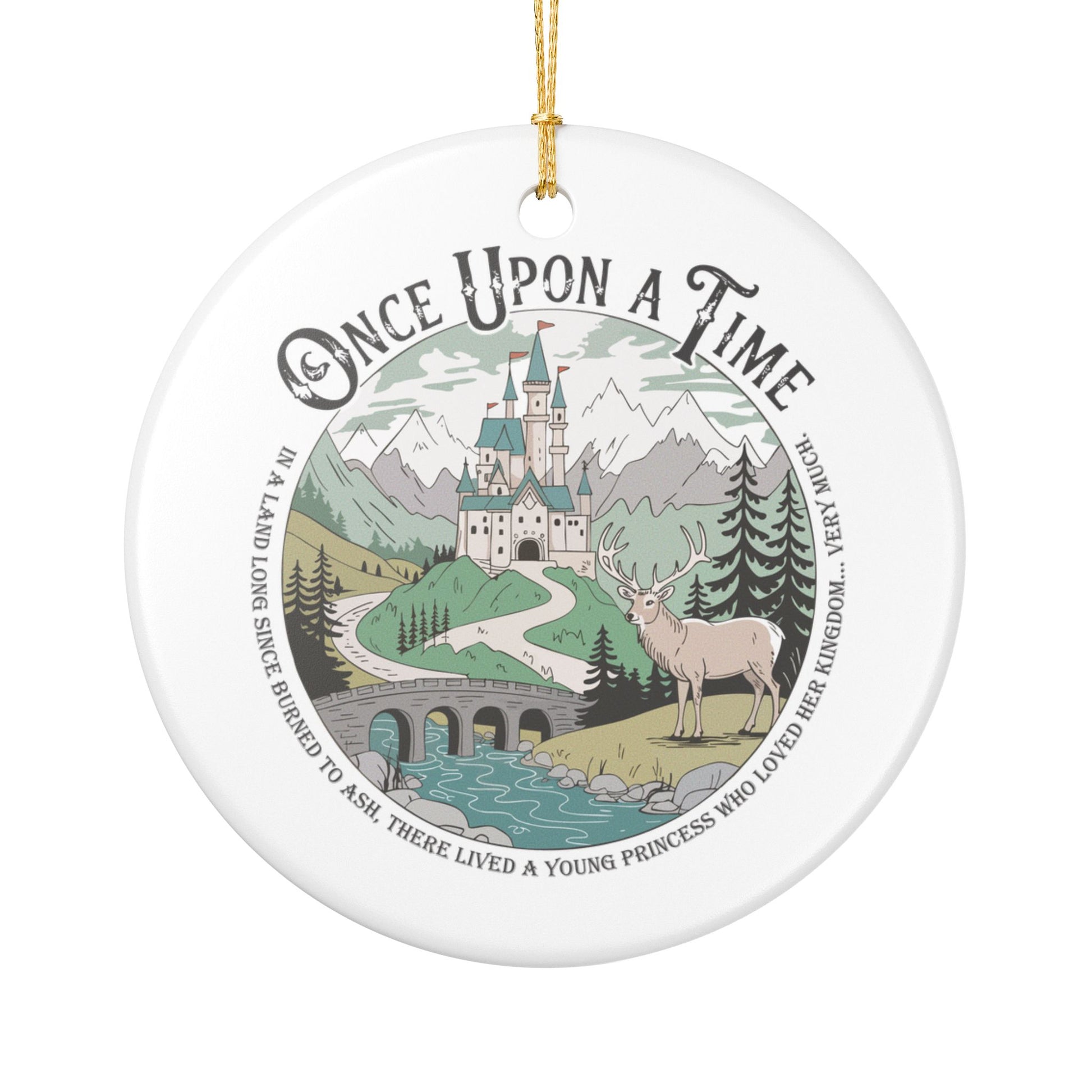 Step into the world of Erilea with this officially licensed Throne of Glass ornament — a collectible piece that captures the heart of Sarah J. Maas’s beloved series. Featuring the enchanting castle scene in Terrasen beneath the words “Once Upon a Time,” this design evokes the fierce beginnings and fairytale endings that fans hold dear.